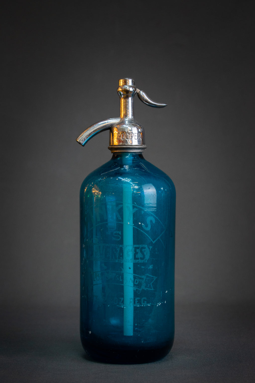 Este es un sifón antiguo de color azul claro, de origen posiblemente europeo (viene con medidas en oz), cinceladas al ácido sobre el mismo vidrio y data aproximadamente de 1920. La tapa es de estaño y se aprecia en buenas condiciones.